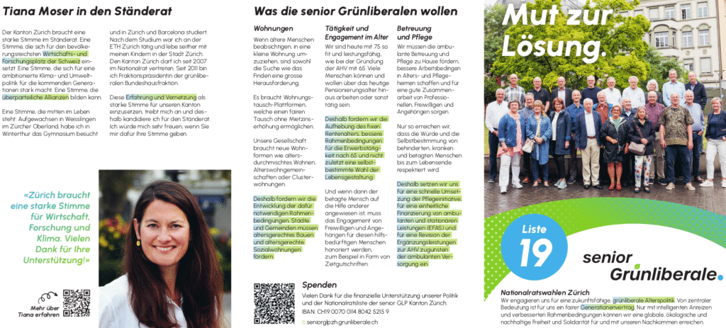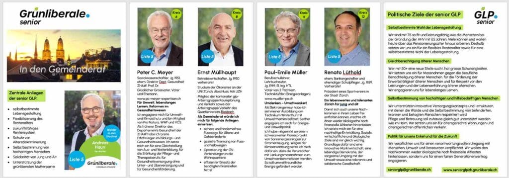 Zum ersten Mal beteiligt sich die senior GLP an den Gemeinderatswahlen der Stadt Zürich. Vier Mitglieder kandidieren je in einem anderen Wahlkreis. Mit unserer senior-spezifischen Wahlwerbung wollen wir die älteren Menschen erreichen und sie bei ihren Anliegen abholen. Dies soll mehr Stimmen für die Grünliberalen geben, aber auch mehr Interesse der GLP für Altersfragen wecken.