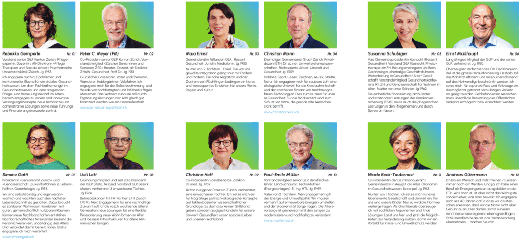 Die Personen auf der Nationalratsliste der senior GLP stehen hinter den Kernanliegen der Grünliberalen: